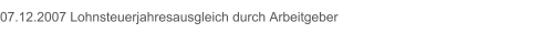 Der Arbeitgeber kann mit der Dezember-Abrechnung den Lohnsteuerjahresausgleich für die Arbeitnehmer durchführen, die ununterbrochen im Kalenderjahr 2007 beschäftigt waren. Eine Verpflichtung besteht dann, wenn am 31.12.2007 mindestens 10 Arbeitnehmer beschäftigt sind. In bestimmten Fällen darf kein Lohnsteuerjahresausgleich durchgeführt werden (z.B. wegen Steuerklasse V oder VI). Gleichzeitig mit dem Lohnsteuerjahresausgleich sind auch die Zuschlagsteuern entsprechend zu ermitteln (Solidaritätszuschlag, Kirchensteuer).